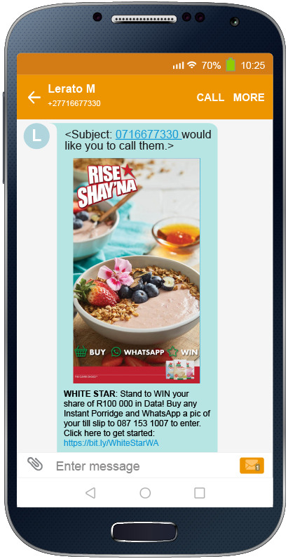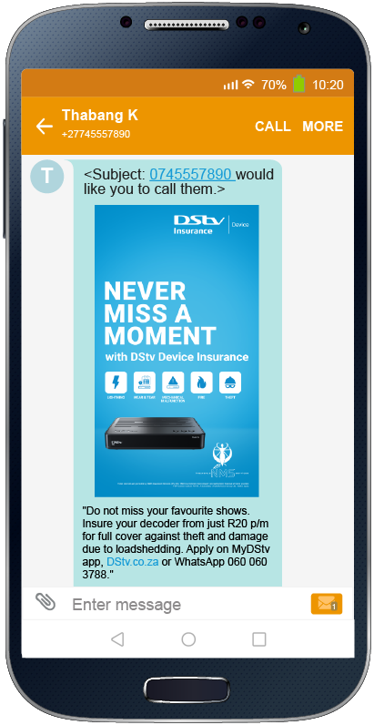 VNA harnesses the pervasive Telco Notification (e.g. Missed Call Alert) by appending rich-media artwork and 200-characters of copy thereby delivering an ad unit which is 100% viewable & brand safe – see campaign screenshots . Resultantly, the visually enticing VNA campaigns enjoy superior engagement rates to SMS based campaigns and at a lower cost per contact. Furthermore, the rich-media artwork is delivered at zero data costs to the consumer which is a key consideration for cost-conscious consumers in the mid- to low-income segments.